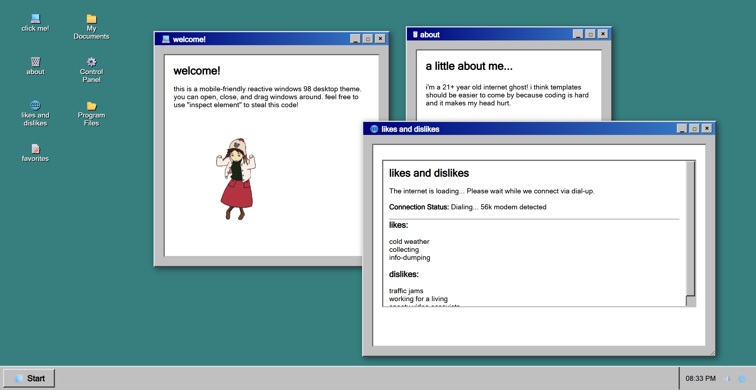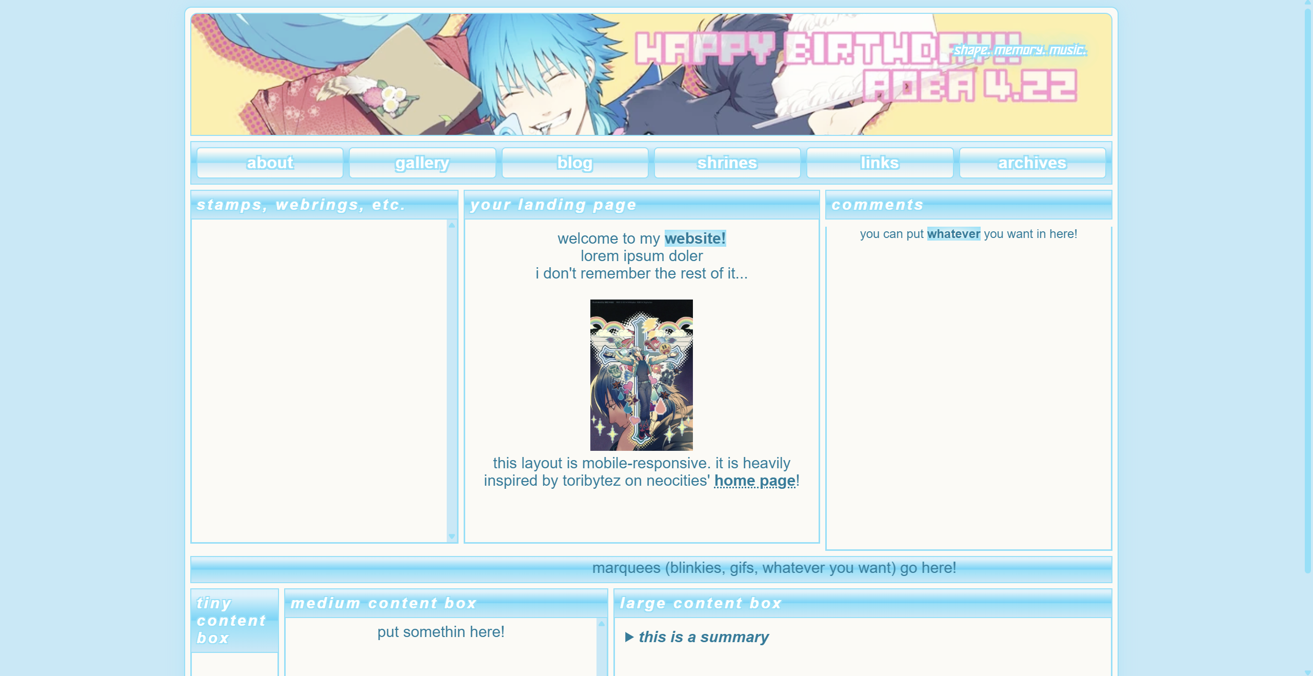 welcome to denpa's layouts site! here i host all sorts of layouts in .html format with embedded css. all you gotta do is hit "view page source," copy-paste the code into your site, and boom!